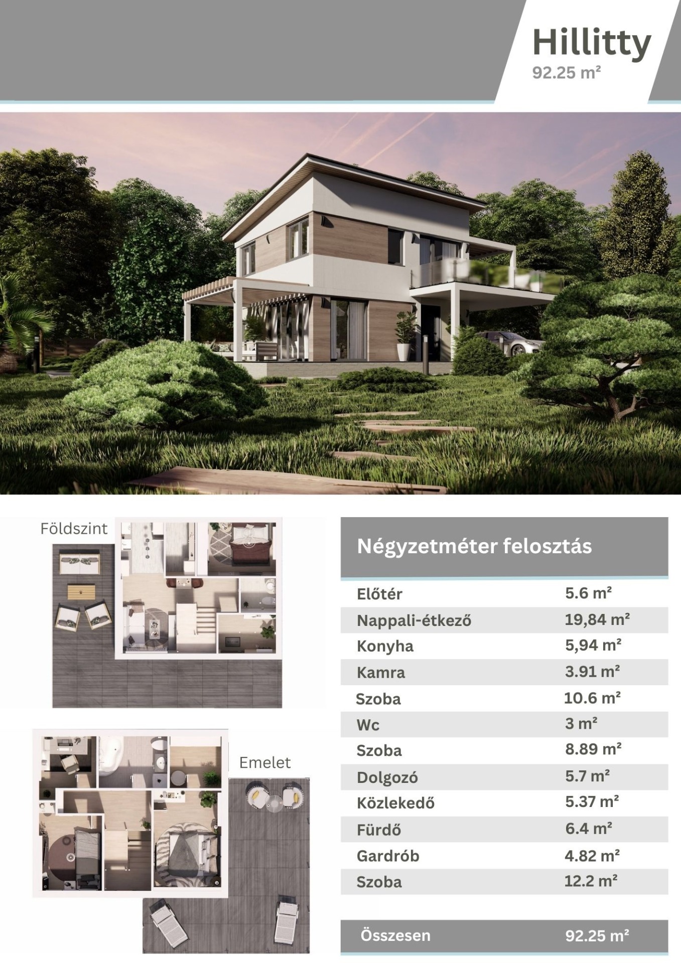 Ideális 4-6 fő számára Bruttó 119 m2 Nettó 92.25 m2 Ajánlott telekterület: minimum 800 m2