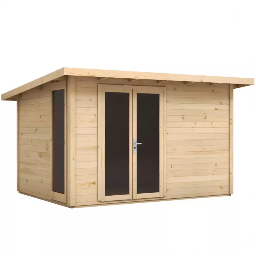 A lucfenyő szerkezet, a modern egyhajlású tető, valamint az időjárásálló aszfaltfedés stabil, tartós és elegáns megoldást kínál hosszú távra. A tágas belső tér lehetőséget ad teljes értékű iroda, kreatív műhely, konzultációs tér vagy akár exkluzív ügyfélfogadó stúdió kialakítására is.