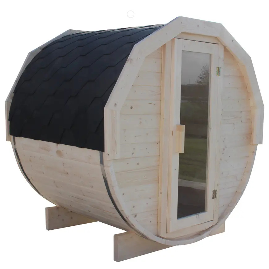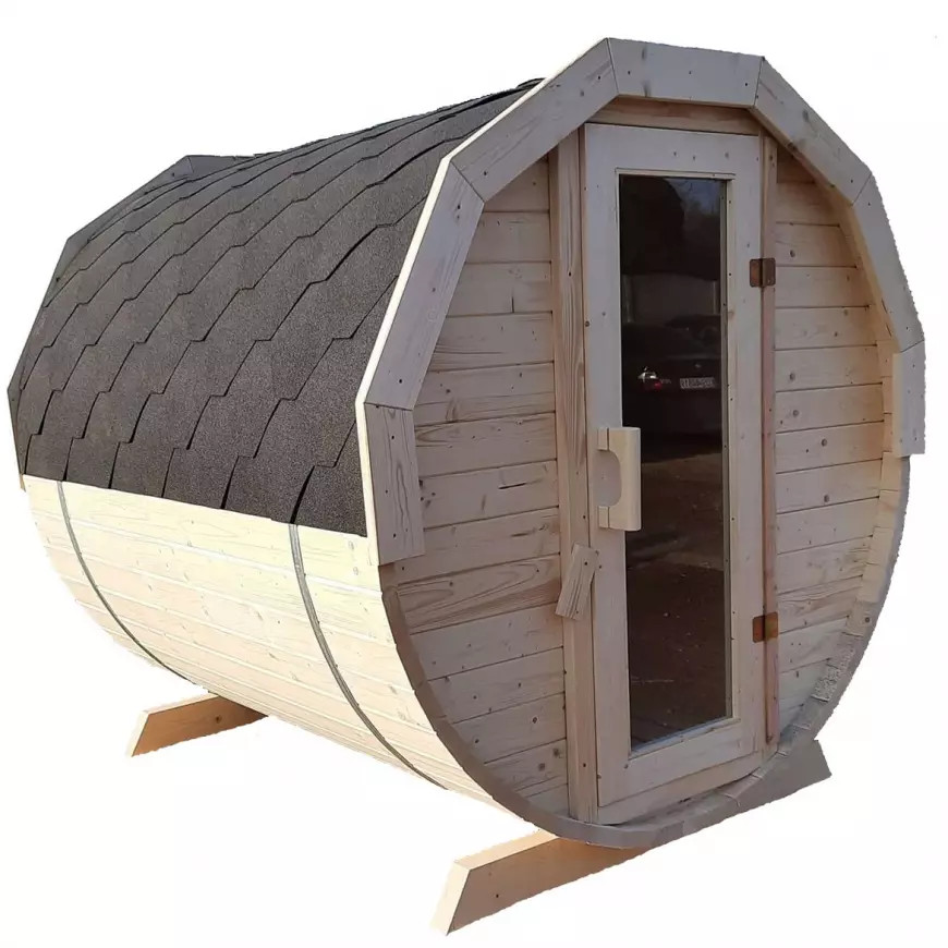 A 44 mm vastag lucfa szerkezet masszív, időtálló és természetesen elegáns megjelenést ad, míg a bitumen zsindely fedés, a rozsdamentes acél bilincsek és az edzett üveges fa ajtó a tartósságot és a prémium minőséget hangsúlyozzák. A karfás padok, a kényelmes belső tér és a 2 méteres kialakítás ideális meghitt, mégis komfortos szaunázáshoz.